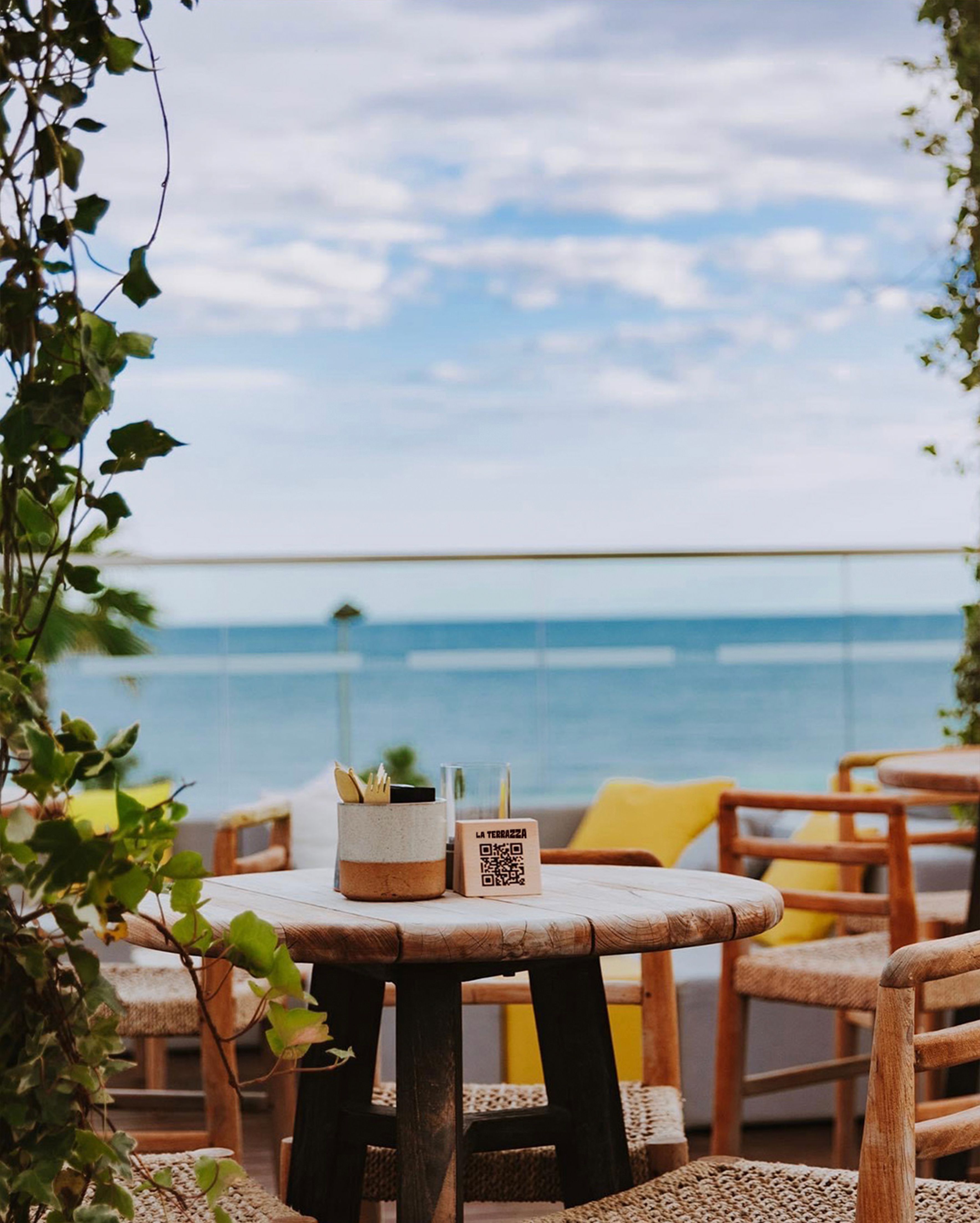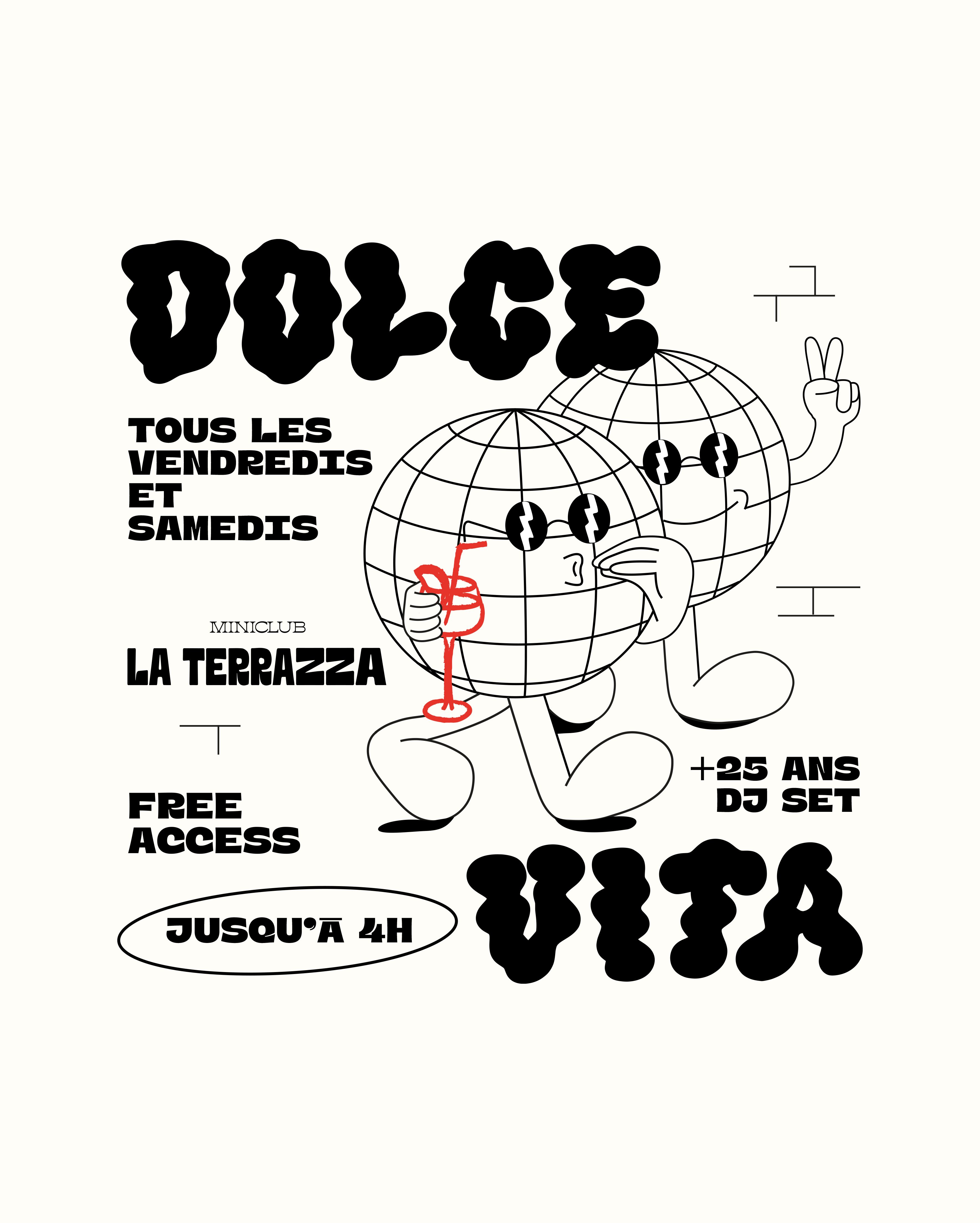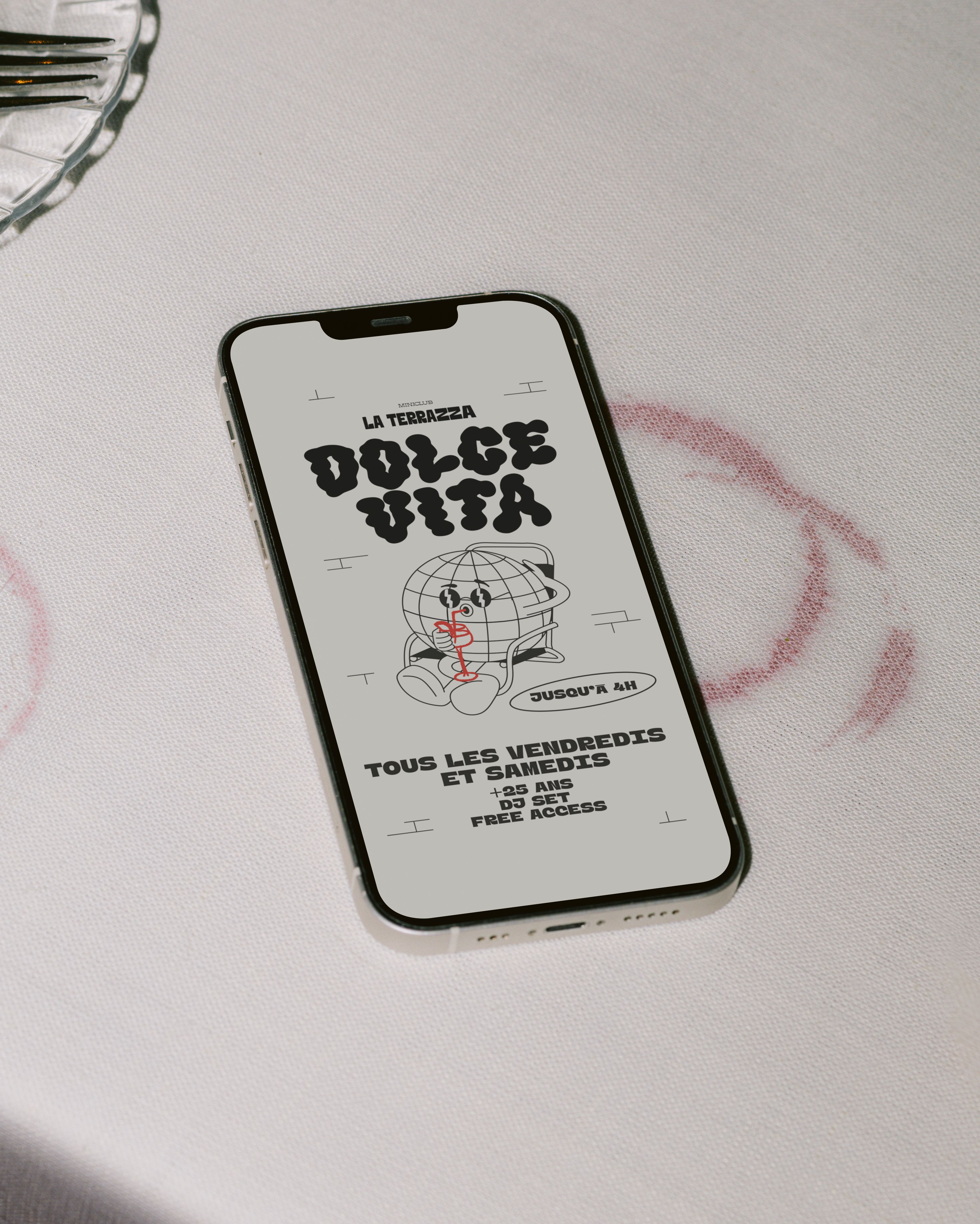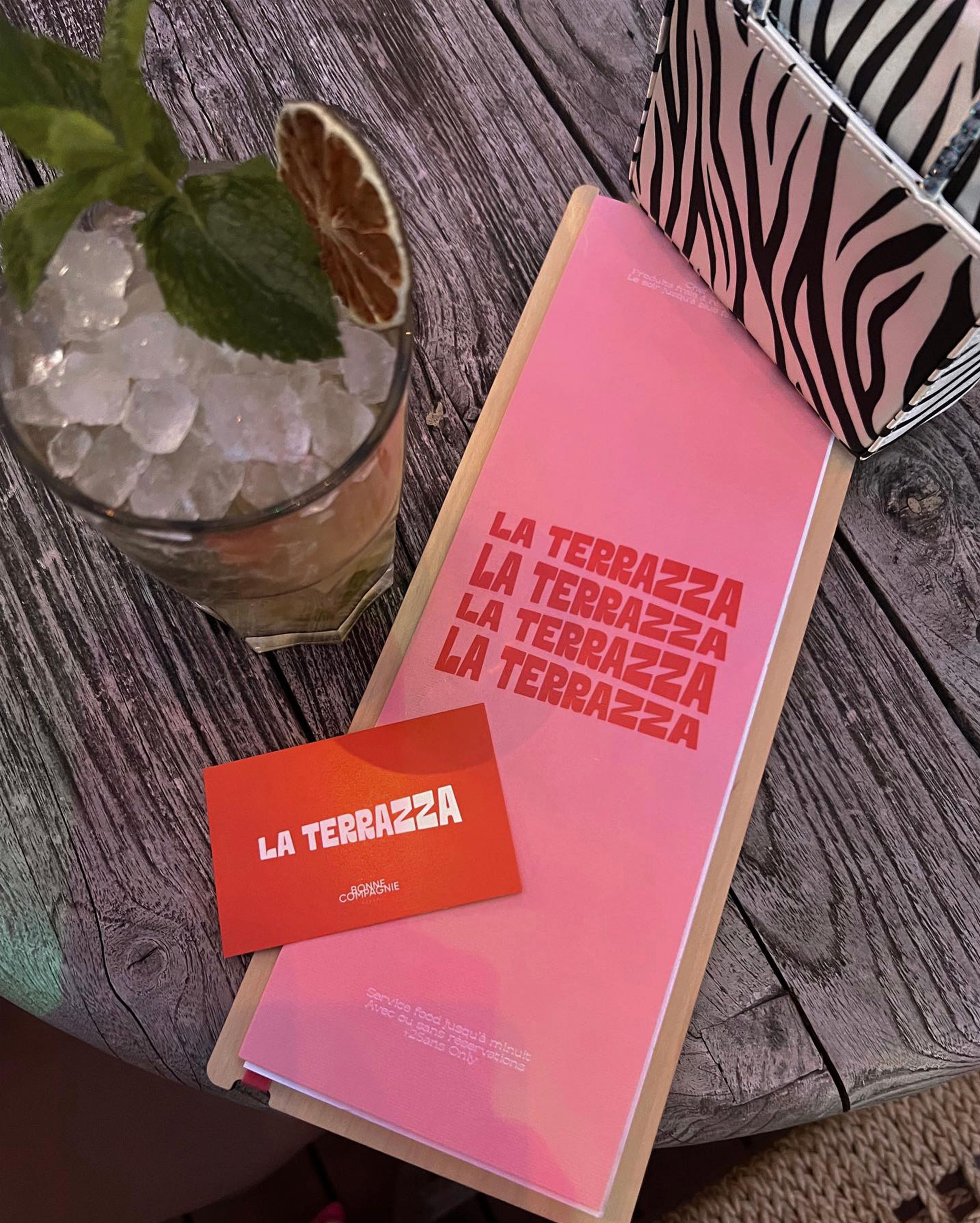 La Terrazza, rooftop festif italien à la Grande-Motte. Création d'identité visuelle aux inspirations italiennes pour ce bar en plein air signé Bonne Compagnie. Déclinaison pour la Terrazza Miniclub. Le rooftop se transforme le week-end en boite de nuit à partir de minuit.