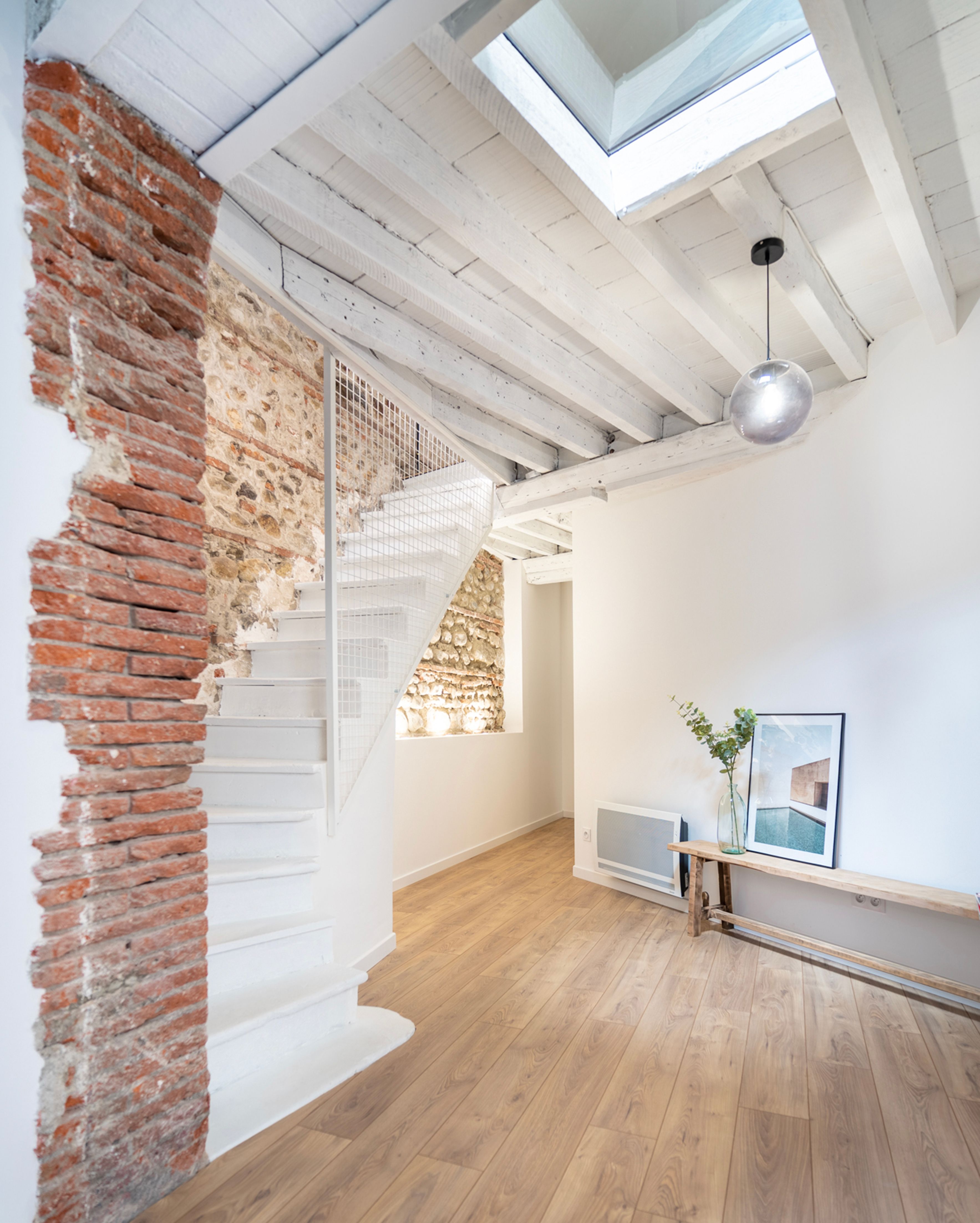 Maison de ville en hyper centre de Perpignan. Rénovation complète pour cette maison des années 1900. Il a fallu revoir toute la distribution des pièces, de la plomberie et de l'électricité pour révéler comme il se doit, le potentiel caché de cette maison de 120m2. La pièce maitresse est sans aucun doute la pièce à vivre avec son plafond cathédrale. Nous avons exploité les combles perdus, dévoilé la magnifique charpente, et transformé 4 pièces en enfilade, en une. Création sur-mesure de la table. Création d'un puit de lumière avec l'installation d'une dalle de verre pour apporter de la luminosité à l'entrée. Création sur-mesure d'un garde corps et d'une grille pour l'entrée. Tout cela respectant une contrainte de taille, un budget limité.